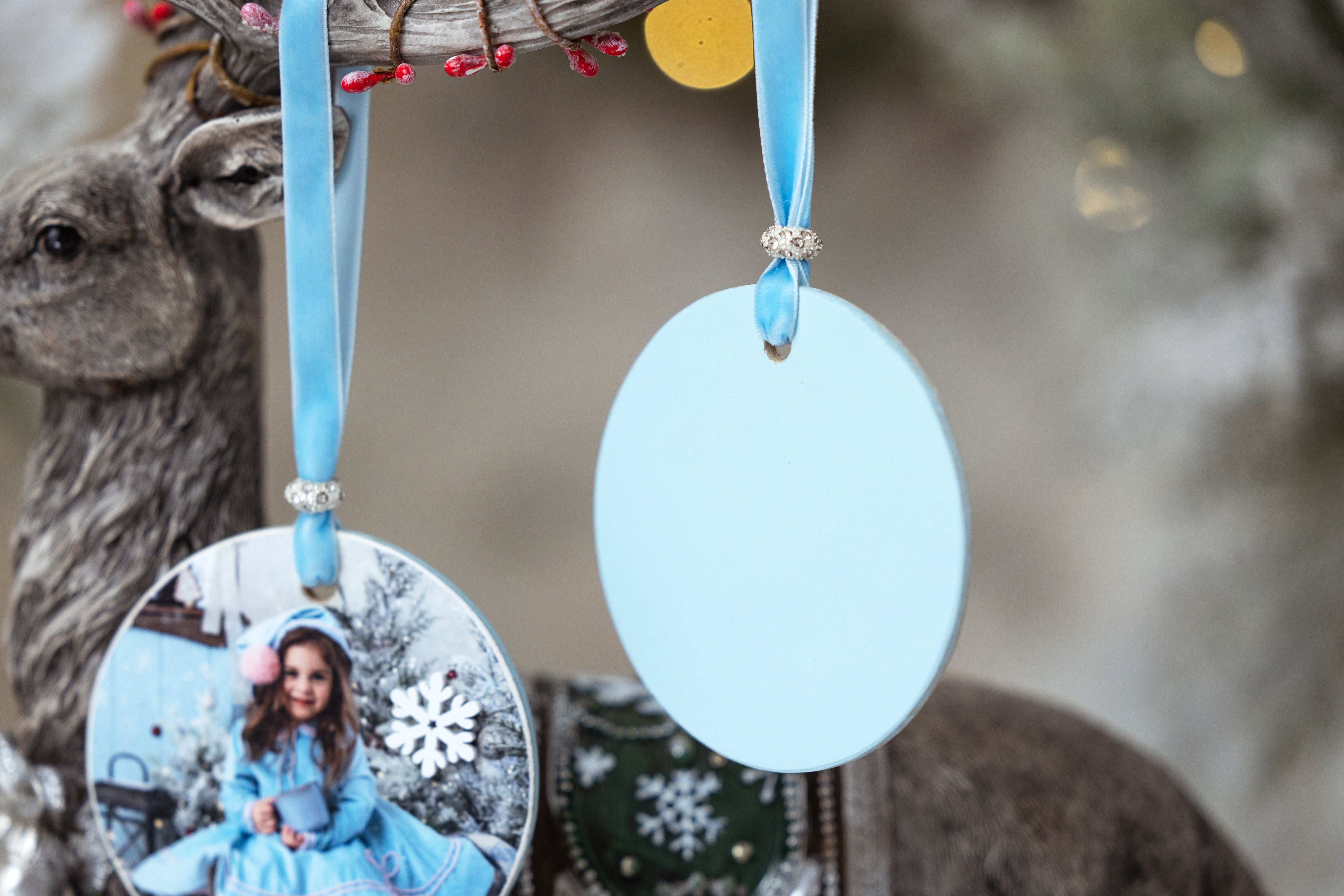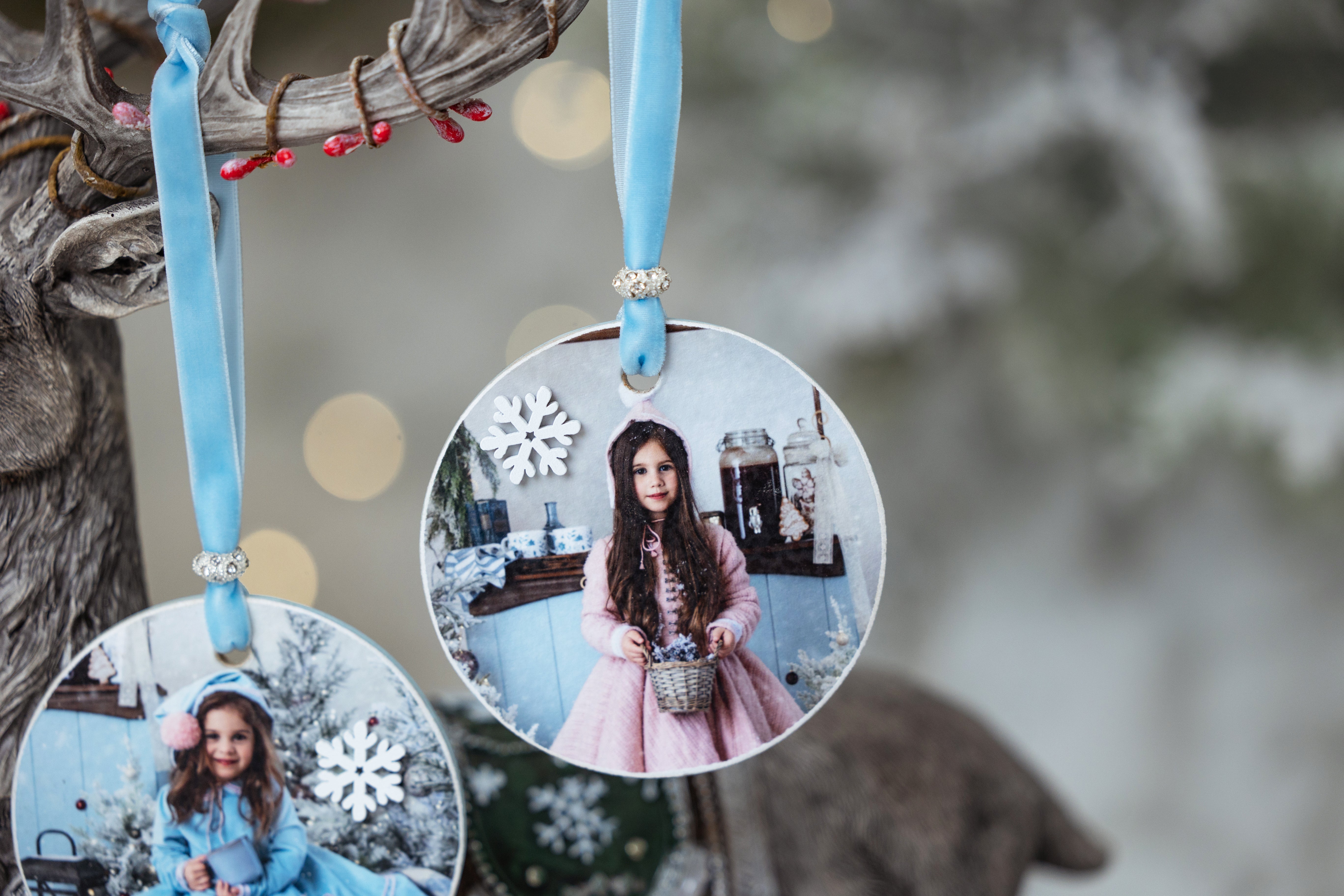 These beautiful ornaments are crafted using a fine art print, professionally coated and mounted onto a wooden circle with soft blue and snowflake wooden accents. The fine art paper gives each image incredible detail, depth, and clarity - making your little one’s portrait look truly magical on the tree.